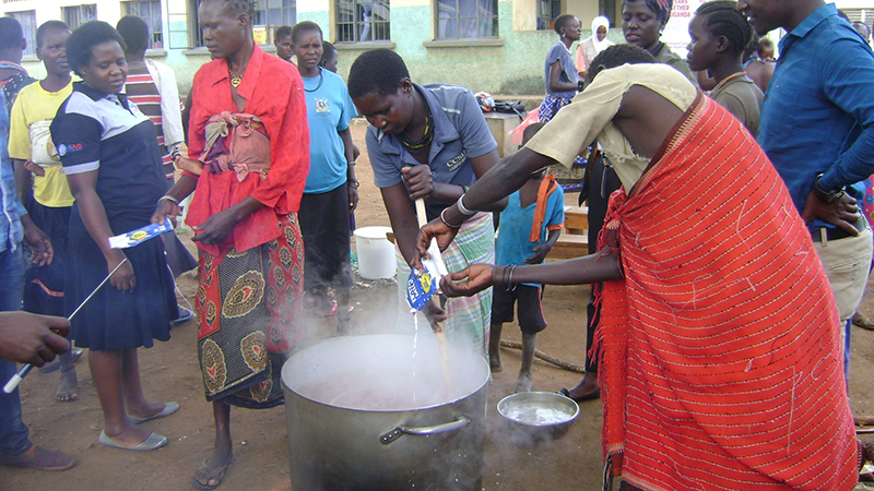 Mothers prepare enriched porridge during the food demonstrations at the Moroto regional referral hospital